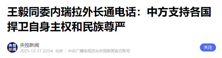 央视新闻:王毅同委内瑞拉外长通电话:中方支持各国捍卫自身主权和民族尊严