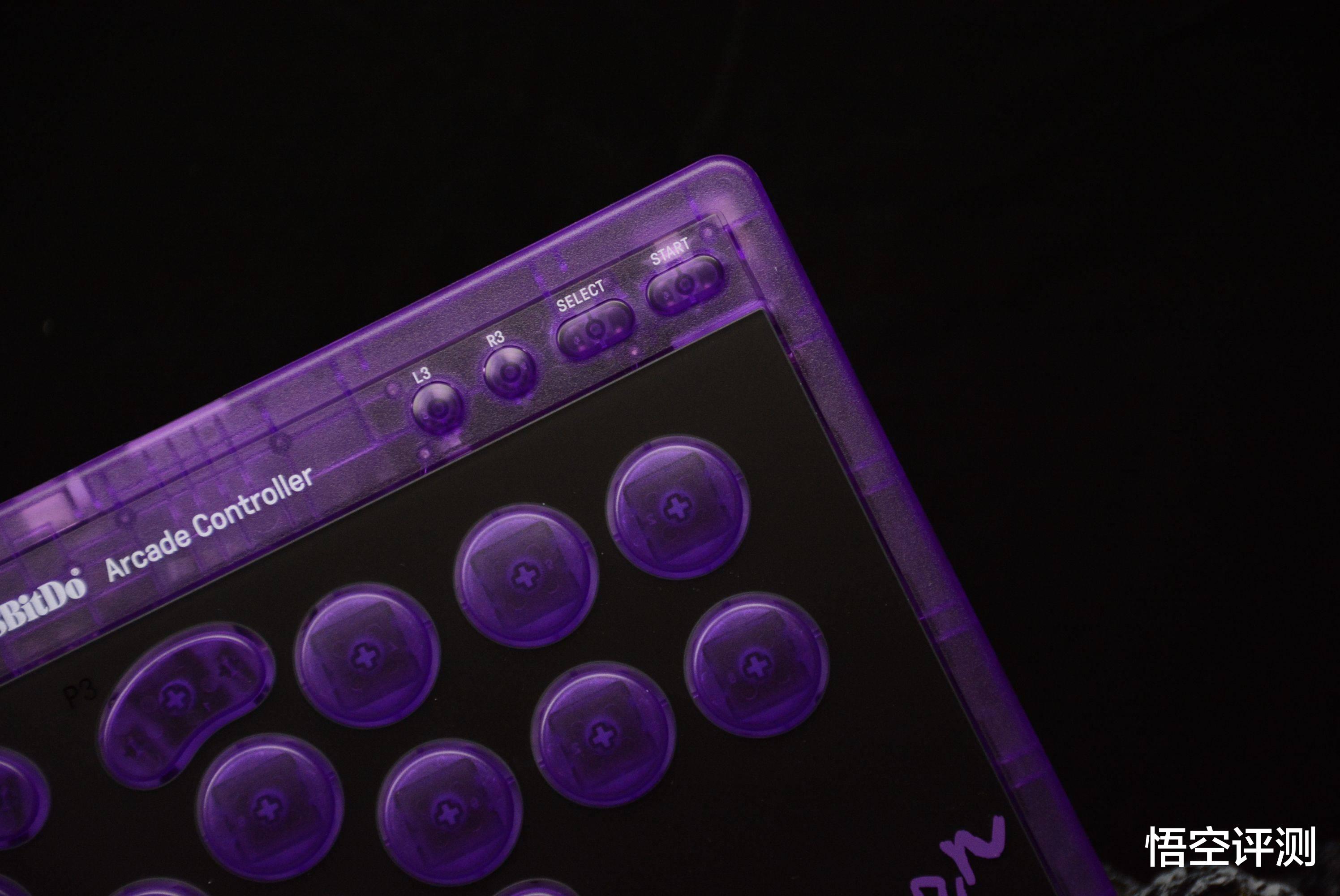 可以说,八位堂天刃星街机控制器Hitbox真正满足了很多玩家的终极梦想,太多人喜欢透明的按键了,而这款控制器完全不需要自己改造,出厂标配就是紫透版本。
