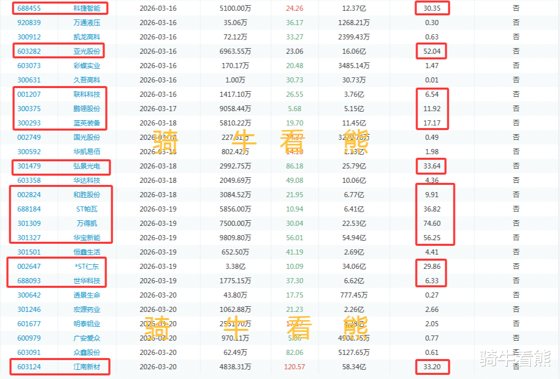 3月19日(周四)ST帕瓦解禁比例达到36.82%;万得凯解禁比例达到74.6%;华宝新能解禁比例达到56.25%;*ST仁东解禁比例达到29.86%。
