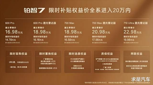 用户从“产品消费者”转变为“品牌共创者、需求主导者”,这在铂智7的购车权益上也有所体现。“全系20万内”“5年0息”等限时权益,不是单纯“一刀切”式的价格让利,而是针对首购用户、置换用户不同的需求,规划不同的权益。尤其首购用户5年0息金融方案,这就是基于用户反馈快速调整的结果,彰显出“用户需求即时响应”的产品共创逻辑。