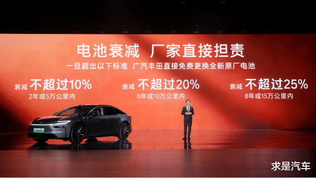 相较于行业内普遍的8年或16万公里电池衰减不超过30%的标准,广汽丰田将标准提升至2年或5万公里内,电池衰减不超过10%;6年或10万公里内,衰减不超过20%;8年或15万公里内,衰减不超过25%。一旦超出这个幅度,将直接免费更换原厂电池。