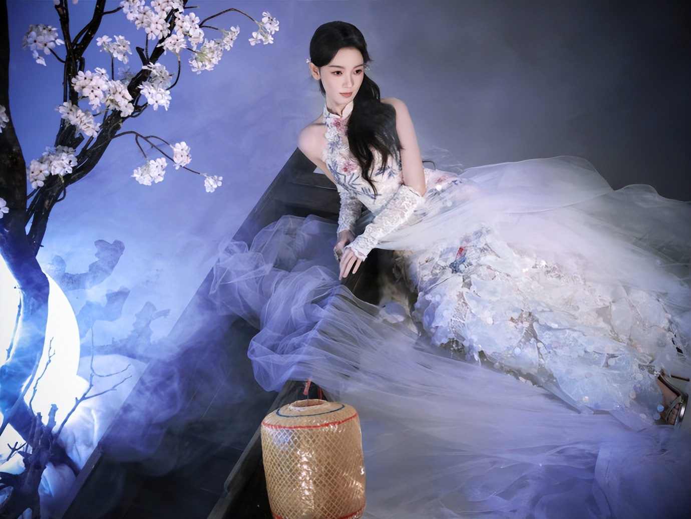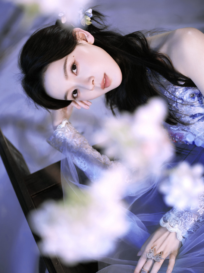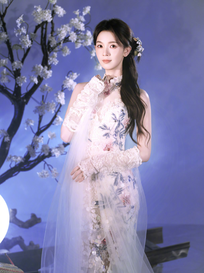她披着长发,发梢卷着自然的弧度,淡紫纱裙的肩侧缀了银线绣的枝蔓纹样,顺着肩线垂到臂弯。右手轻握卷着的素色绢布,布角沾着点浅墨痕,背景的蓝调光晕裹着梅花枝,她往镜头抬了抬眼,睫毛卷得轻,连绢布垂落的弧度都跟着柔下来,是她惯有的清冷里掺了点软。