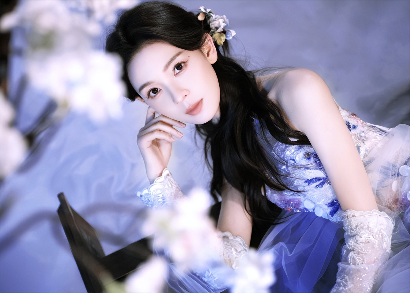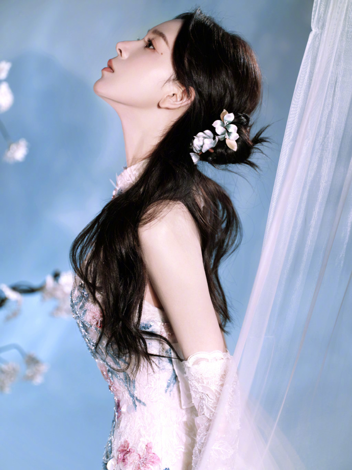 她抬着右臂,浅粉纱裙的透纱袖顺着臂弯垂下来,袖身泛着柔光。发间的白梅露在额角,她往侧方抬了抬眼,睫毛轻颤,背景的蓝调光晕裹着她的肩,连抬臂的松弛都带着清冷的柔,刚好是她身上国风气质的底色。
