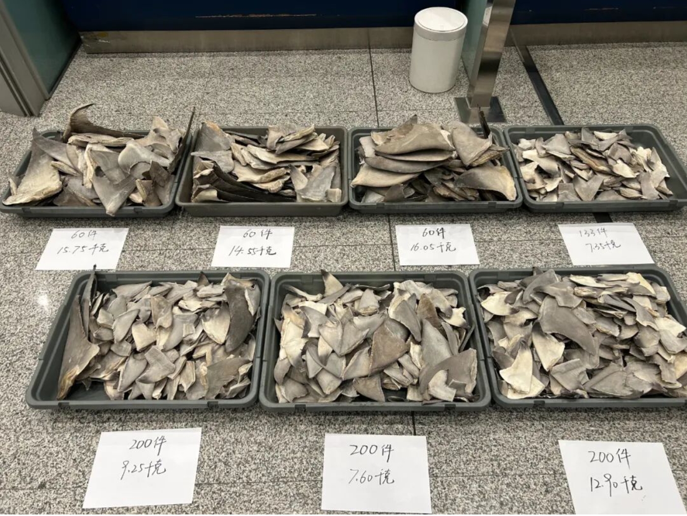 经开箱查验,在该名旅客行李中查获疑似鲨鱼翅913件,净重83.45千克。