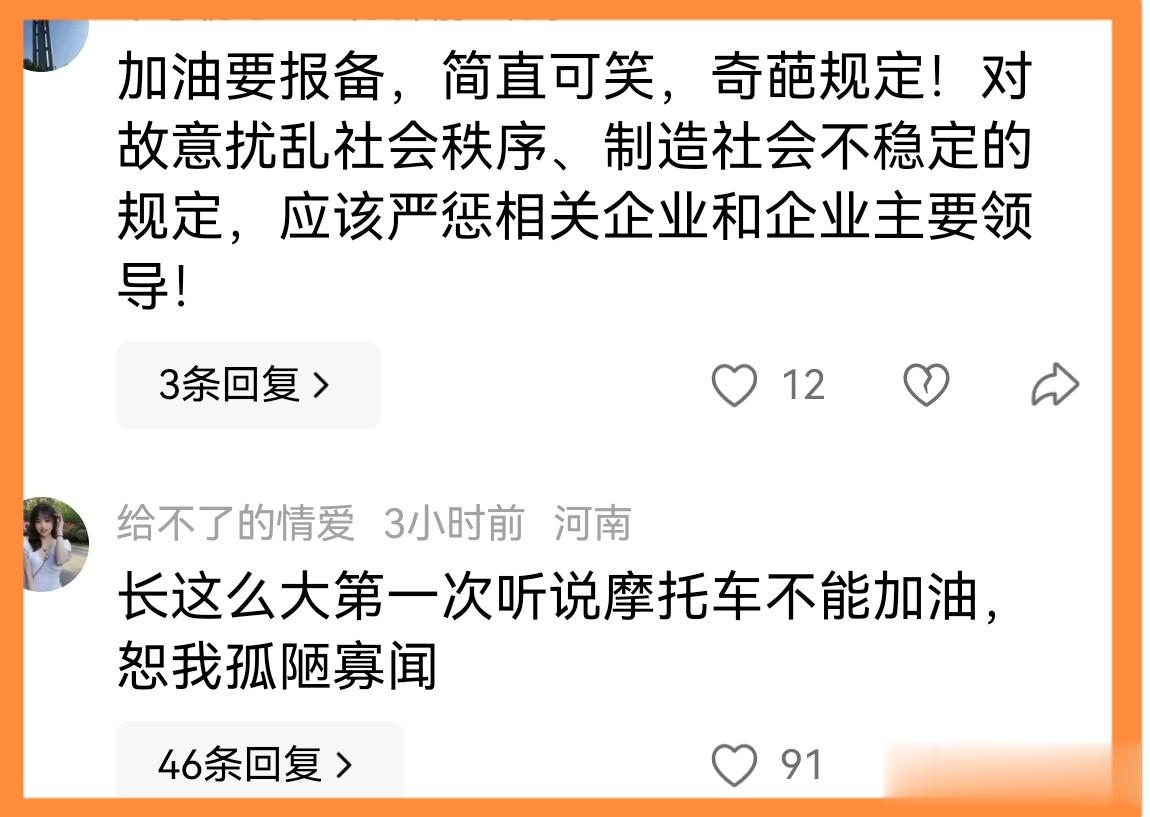 有人认为,摩托车也是车,凭什么不能加油,对此规定产生了巨大的质疑。