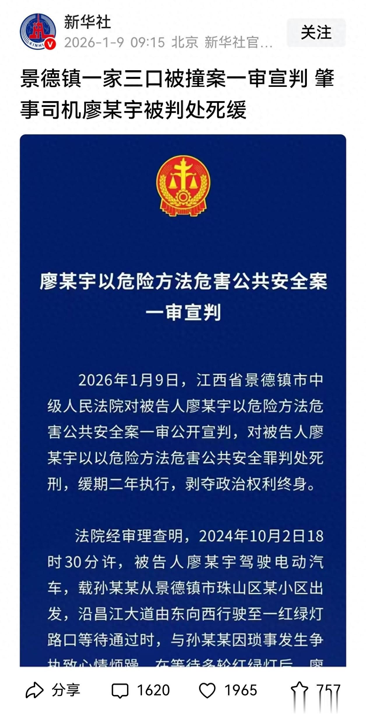 判了!廖某某驾车撞死一家三口案,经过三次延期后,该案在景德镇中院一审宣判廖某某死刑,缓期两年执行!