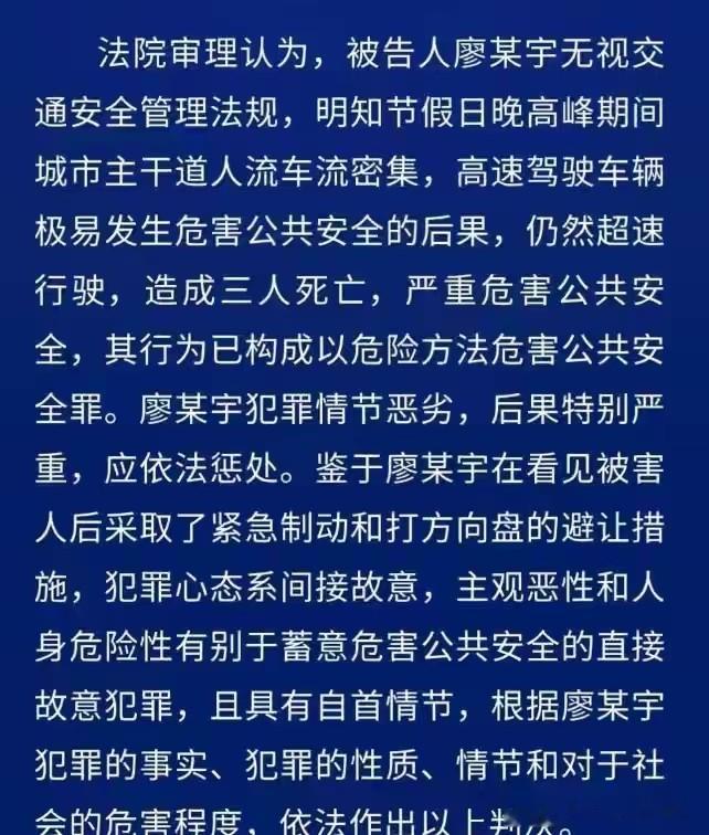 通报显示,判决书中明确列出“不立即执行死刑”的理由,法庭认为,廖某某在看见被害人后,采取了紧急制动和打方向盘的避让措施。