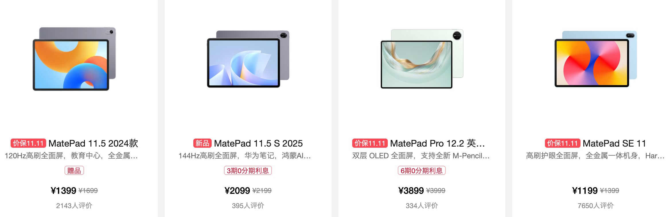 平板方面,MatePad系列同样有降价,像MatePad 11.5 2024款降300元,MatePad 11.5S降500元,MatePad SE 11也有200元的优惠。