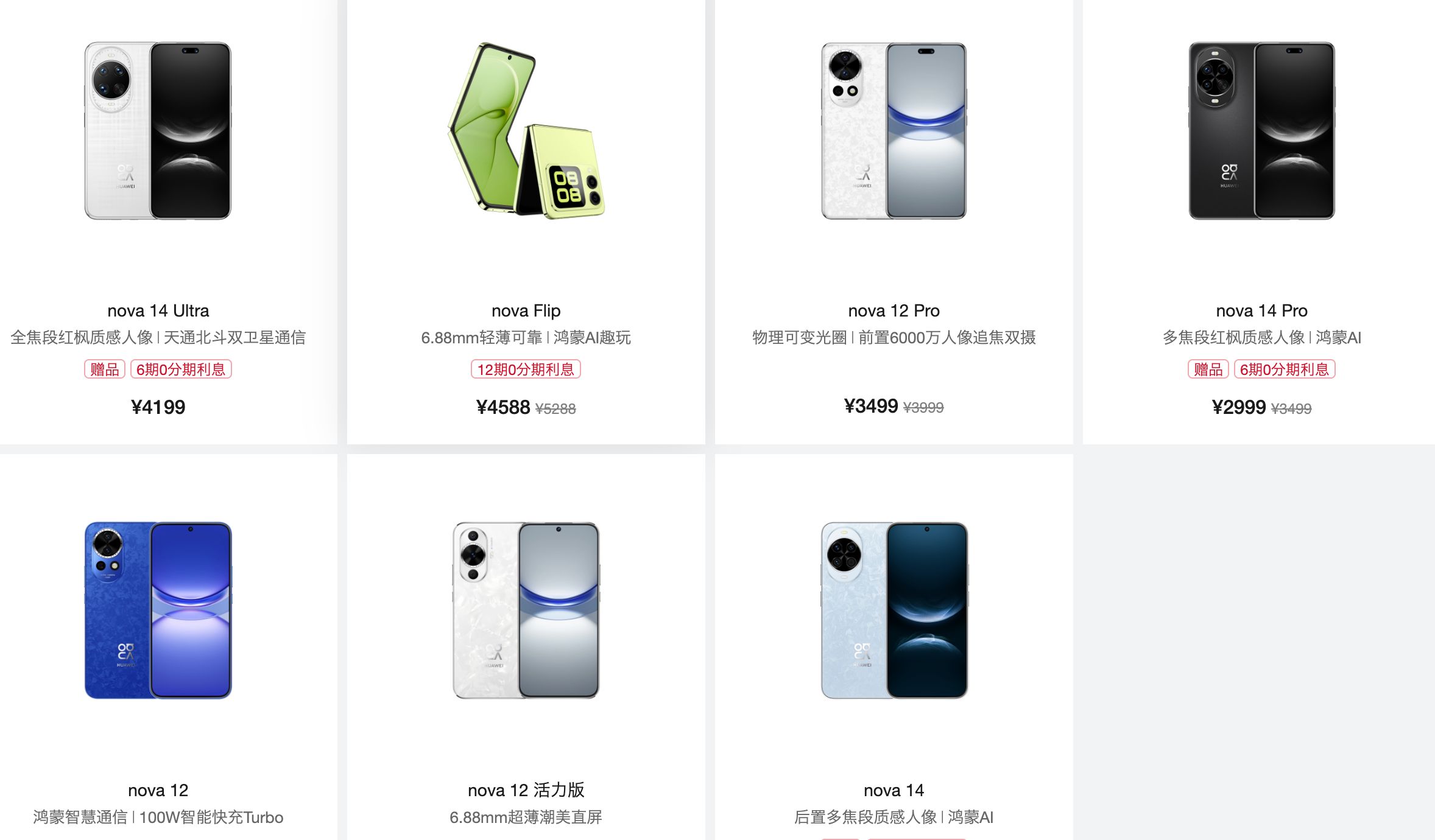 nova12和12Pro分别降600元和500元,nova14、14Pro也都有350-500元的优惠。nova12活力版和novaFlip,折扣也在400-700元左右。