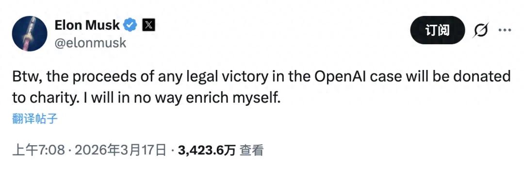 2026 年 3 月 17 日,Elon Musk 表示,自己在与 OpenAI 相关诉讼中若获得任何法律赔偿,所得都将捐给慈善机构,自己不会从中获利。