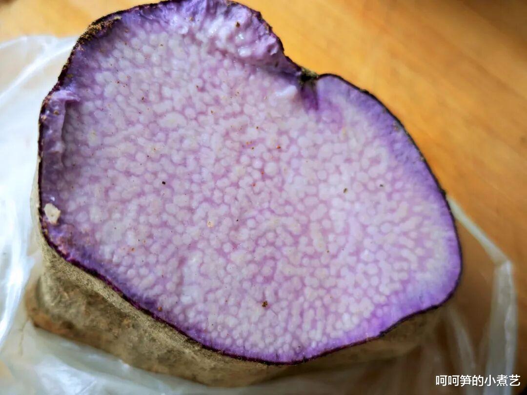 还有一种叫做“大薯”,和白色的“金薯”不同,大薯表面凹凸不平,多为大块状,刀切的时候感觉是脆的,削皮后也有粘液,但是接触后不会和山药一样引起皮肤痒痛。最特别的是大薯刚刚切开是白色的,氧化时间长了就会变紫,时间越久越深,所以又被叫做紫大薯。