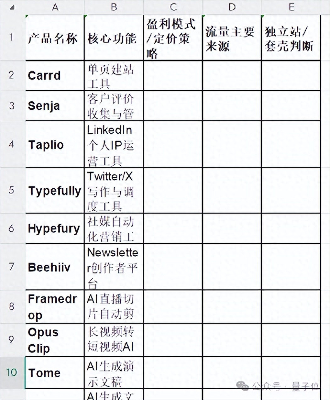 我假装自己是一位关注Micro-SaaS领域的投资人,将网络上搜集来的热门产品列了个表格,但表格里只给了产品名称和功能。