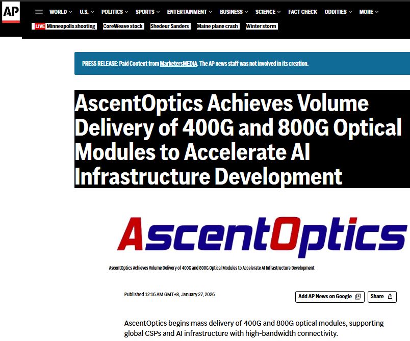 【环球网财经综合报道】据美联社消息,光学通信解决方案领先提供商AscentOptics正式宣布,其400G和800G光模块产品线已成功进入大规模生产阶段,并正在向全球多个地区的云服务提供商(CSP)进行批量交付。这一举措满足了日益增长的人工智能和云计算基础设施对高带宽连接的迫切需求,标志着公司在高速光互连技术及全球供应链交付能力上迈出了关键一步。