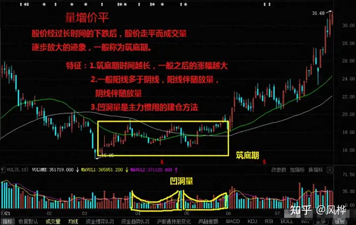 2、量增价平要转阴,低位持续为建仓,当一只股票在高位或者在上升趋势中,出现了成交量增加而股价却得不到拉升,这种就是一个变盘信号,一般是卖盘太多所导致,就是出场的信号;但如果在经过长期的下跌趋势后,股价开始走平成交量却呈现逐渐的放大,那么就是筑底的期间,一般阳线会多于阴线,主力会用凹洞量的惯用方法进行建仓。