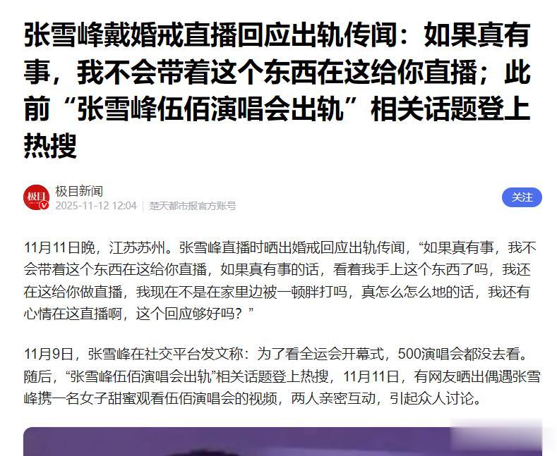信息来源:张雪峰戴婚戒直播回应出轨传闻:如果真有事,我不会带着这个东西在这给你直播;此前“张雪峰伍佰演唱会出轨”相关话题登上热搜