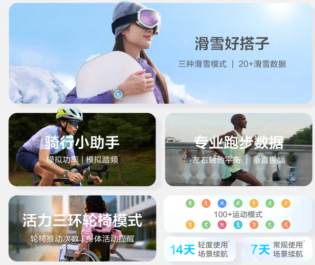 其中最引人注目的是业界首发的骑行模拟功率功能。对于喜爱骑行的她,无需额外购置昂贵的专业功率计,手表通过融合身高体重、车辆参数、实时速度心率及环境风速等信息,即可精准测算模拟功率与踏频,帮助她科学评估训练强度,实现从“休闲骑”到“进阶训练”的能力跃升。此外,单次运动记录最长支持600小时,足以完整记录长途骑旅的每一程;新增的跌倒检测与高原关爱功能,更为她的户外探索增添了坚实的安全保障。