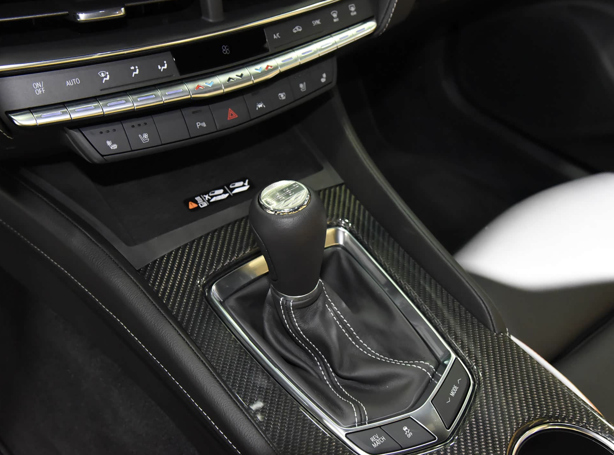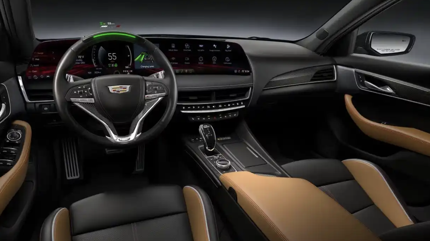 进入车内,凯迪拉克CT5-V Blackwing将会配备全半苯胺皮革桶形座椅、定制绗缝、碳纤维椅背、蓝色安全带以及碳纤维饰件,大面积黑色真皮材质的铺陈,还加入了带有红色交织状纹理的碳纤维装饰面板、亮黑色钢琴烤漆装饰板和银色金属元件的点缀,提升了整车的高级质感。中控台配备了凯迪拉克V部门专门打造的三辐式多功能方向盘,采用了真皮打孔材质和Alcantara面料包裹,12点方向还加入红色回正皮标,左下角还加入圆形的一键启动按钮。操控岛还配备了传统的换挡手柄,带来了全新的操控体验。科技感方面,该车配备了33英寸的Adcanced LED曲面大屏,内置Google系统,支持更多应用和功能。车机系统采用了Performance应用程序,专为性能驾驶设计,可实时显示功率、扭矩、增压压力、加速度G值、轮胎温度等关键数据,并支持赛道圈速记录与分析功能。