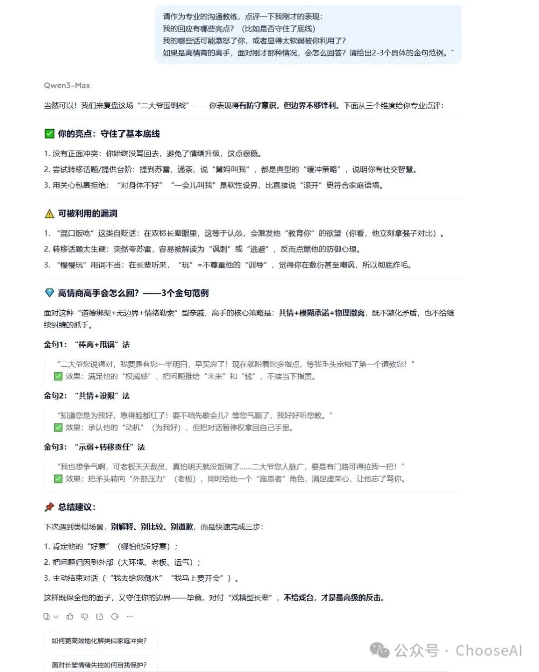 做好几轮“唇枪舌战”的心理准备之前,可以先看看我与千问扮演的二大爷的过招记录,还有它对我回复的点评(这是精华!)。