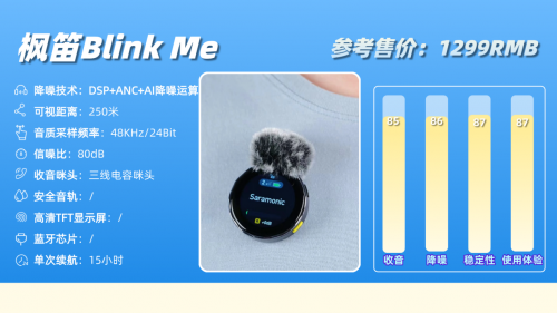 枫笛深耕轻量便携音频领域多年,其BlinkMe领夹麦克风采用极简卡片式机身设计,单发射器仅重6.5克,搭配磁吸隐形领夹,触感细腻且隐蔽性拉满,日常佩戴与户外拍摄中摩擦碰撞后不易损坏。机身搭载高灵敏度全向拾音头,支持48kHz/24bit专业级音频采样,经过新一代智能ENC降噪技术优化,能精准过滤室内轻微杂音与户外微风干扰,满足日常短视频、Vlog等轻量场景的高清收音需求。