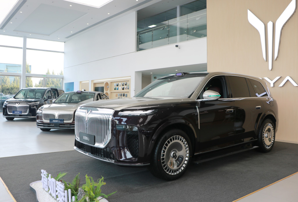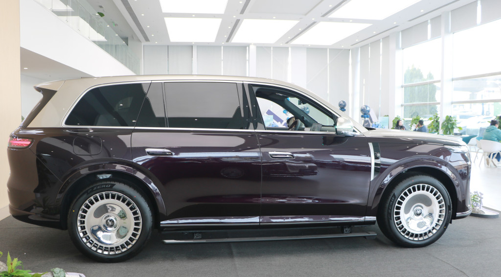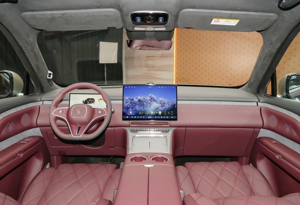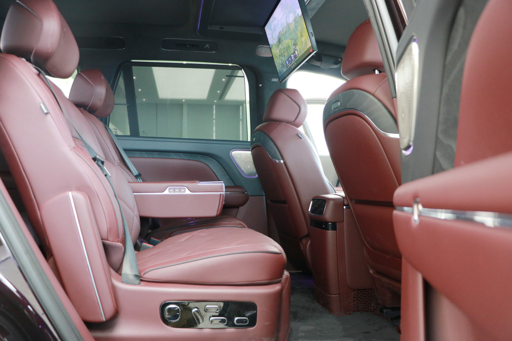 车身侧面,新车线条平直,搭配庞大的车体,令整车看起来非常魁梧大气。新车采用半隐藏式车门外拉手,具备电动侧踏板和迎宾光毯功能,还配备和劳斯莱斯同款大饼轮,奢华感非常突出。车身尺寸方面,新车长宽高分别为5230毫米/2025毫米/1817毫米,轴距为3120毫米,定位六座大型SUV。
