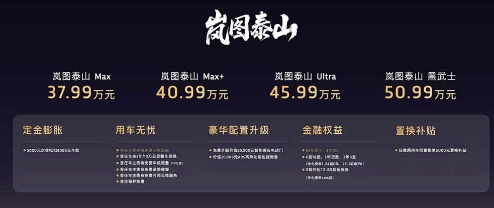 11月18日,岚图汽车旗下的全新旗舰大六座SUV——岚图泰山正式上市,市场指导价为37.99万元至50.99万元!这台车的产品亮点非常多,基于800V高压平台打造,大电池的插混动力,纯电续航350公里,综合续航超1400公里;底盘方面更是一口气拿出了三腔空悬、EDC魔毯功能以及后轮转向系统,性能直接“拉满”;此外,岚图泰山还搭载了华为乾崑ADS 4和鸿蒙座舱5,智能化同样做到了“天花板”!