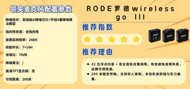罗德Wireless GO III延续口袋级轻薄设计,机身小巧便携自带领夹,佩戴隐形,开箱自动配对,新手上手零门槛。Gain Assist智能增益自动平衡音频电平,规避爆音、音量过低,无需手动调参;发射器与接收器均内置高品质麦克风,支持“前后双录”,满足双人访谈、镜头内外互动等场景。第四代2.4GHz无线传输,100米无遮挡稳定无断连,延迟可忽略,兼容手机、相机、电脑,配件含转接头、防风罩等,操作极简、音质扎实,是“省心高效”创作者的高口碑之选。