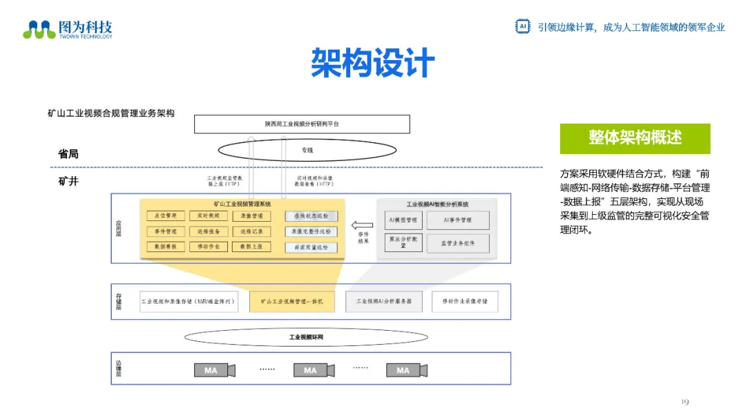 他提出,矿山智能化转型的核心在于“合规化基础上的智能升级”,图为科技打造的“前端感知-网络传输-数据存储-平台管理-数据上报”五层架构解决方案,实现从现场采集到上级监管的完整可视化安全管理闭环。
