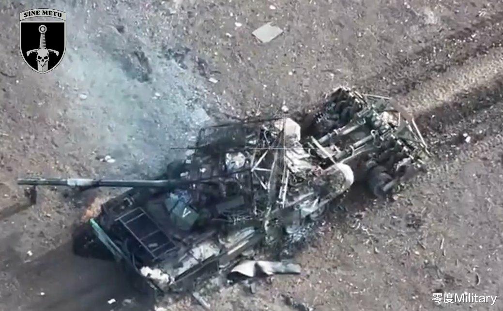 从视频内可以看到这是乌克兰无人机在空中拍摄的视角,该无人机追击一辆行驶中的俄军主战坦克,随后将一枚弹头投掷在坦克的发动机舱附近,使其失去行动能力,最终再次投掷一枚弹头击中坦克的炮塔顶部将其击毁。根据事后拍摄的照片可以识别出这是一辆俄罗斯出口版T-90S主战坦克。