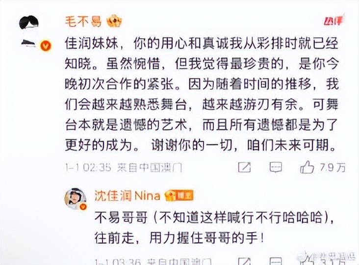 跨年失误后,沈佳润的道歉获得了前辈的温柔接纳。毛不易的回应堪称典范,他肯定了她的用心,并说:“舞台本就是遗憾的艺术,所有遗憾都是为了更好的成为。”父亲小沈阳则用一句充满东北特色的“加油你还早儿呢”来安慰,言语间将这次失误置于漫长职业生涯的起点来看待。