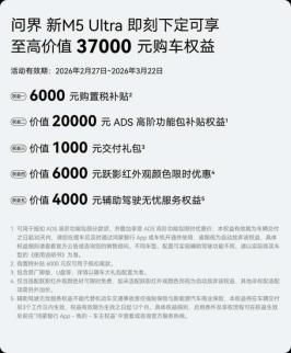 恰逢春回大地、芳华绽放,为回馈广大用户的热爱与支持,问界M5推出春日专属礼遇。2026年2月27日至2026年3月22日期间,下定问界新M5 Ultra即可享受至高价值37000元购车权益,包含6000元购置税补贴、价值20000元ADS高阶功能包补贴、价值1000元交付礼包、价值6000元跃影红外观限时优惠、价值4000元辅助驾驶无忧服务权益,以满满诚意,让每位用户轻松拥有智能与舒适兼具的出行体验,奔赴一路繁花似锦的美好。