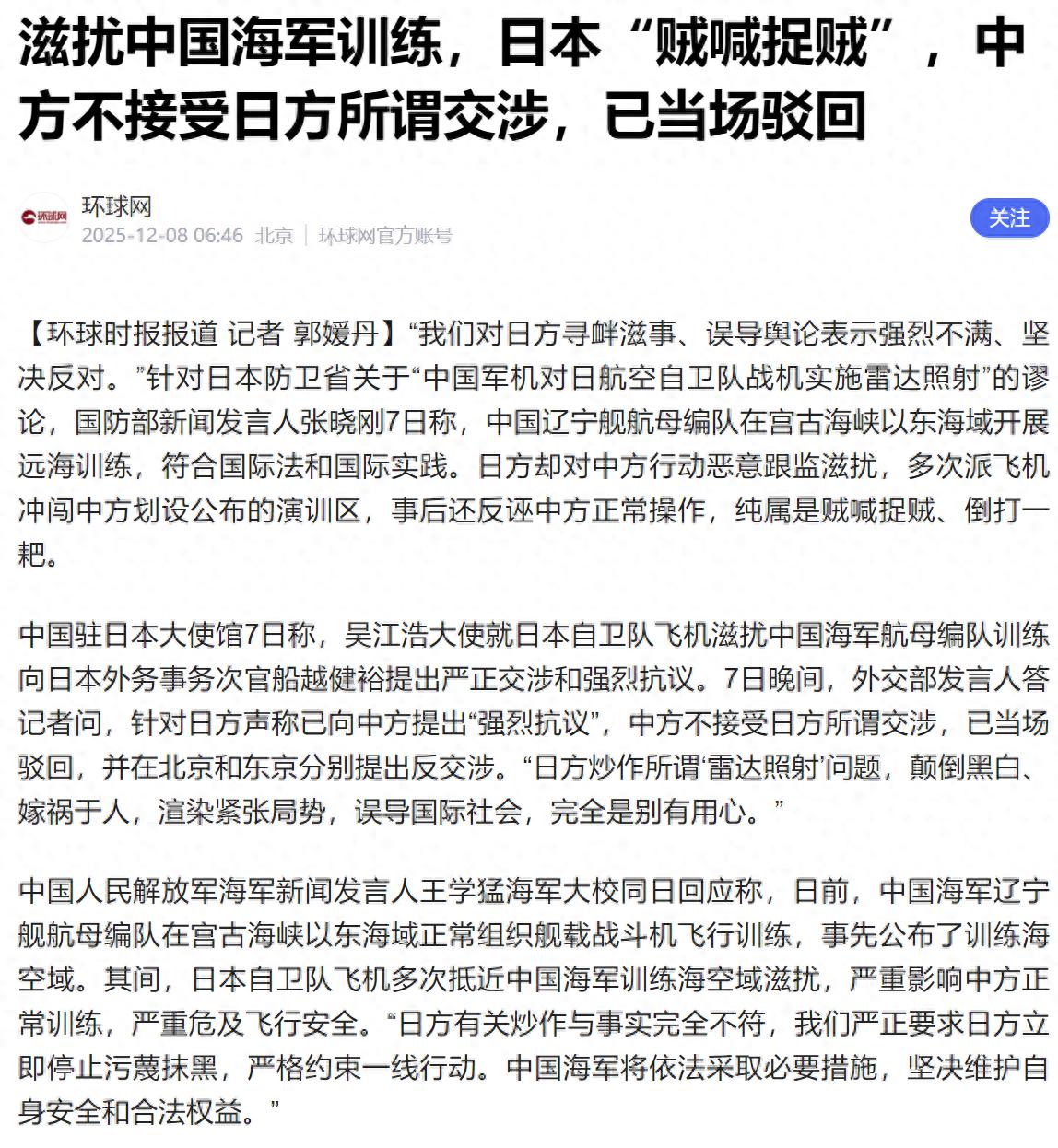 一来,给这场中日空中交锋定调,明确解放军的行为是正常操作,寻衅滋事的是日本自卫队。