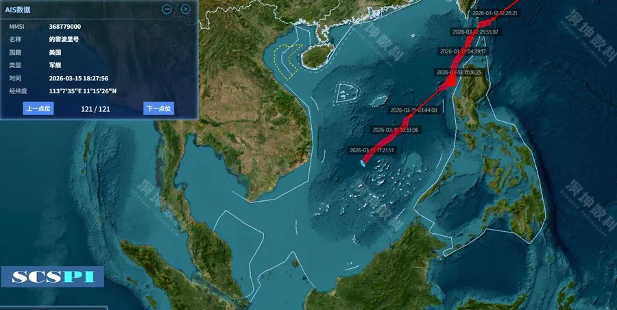 3月15日下午三时许,“的黎波里”行至南中国海中部,并保持20节左右航速