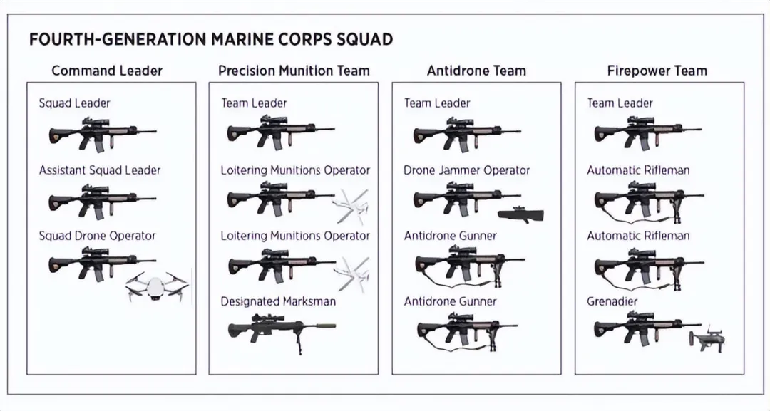 美陆战队2024年实行15人步兵班,配一架侦察无人机、两枚巡飞弹,15支M27步枪,反无人机枪1支