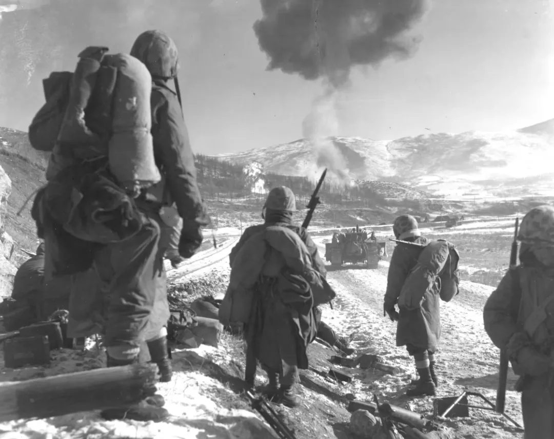 1950年12月,美陆战一师在突围中注视美军战机轰炸志愿军阻击阵地