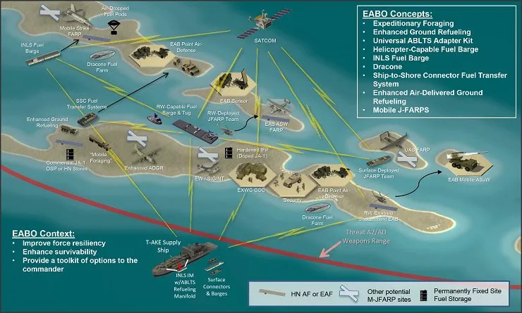 在新的战法体系中,海军陆战队将是一支“Stand-in Force”(SIF),意为在敌方火力打击范围内活动的部队。具体的作战方式分为三种“远征前进基地作战”(EABO)、“滨海作战”(LOCE)与“侦察与反侦察”(RXR)。分别指的是,自敌方控制范围内突击并建立前进基地,对敌方军用与民用船只与基地进行打击,为己方提供关键信息并遮断敌方侦察。这些任务实际上经常是融合的。