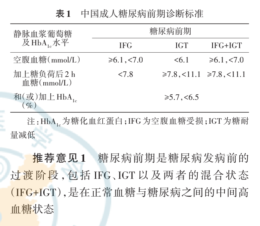 此外,在采用标准化检测方法且有严格质量控制的医疗机构,糖化血红蛋白(HbA1c)5.7%~6.4%也可作为糖尿病前期的诊断标准。
