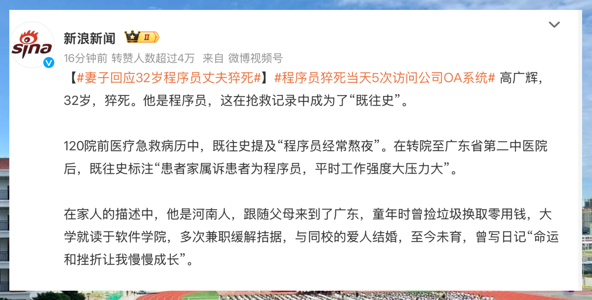 今天上午,新浪新闻后续跟进报道32岁程序员猝死新闻。