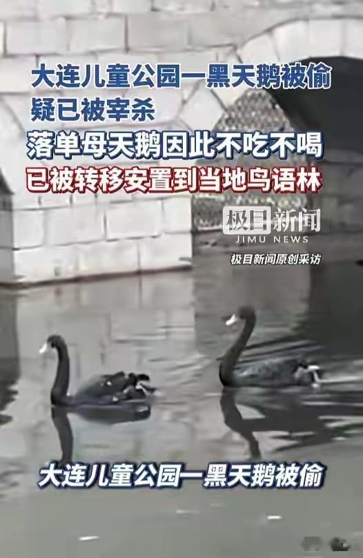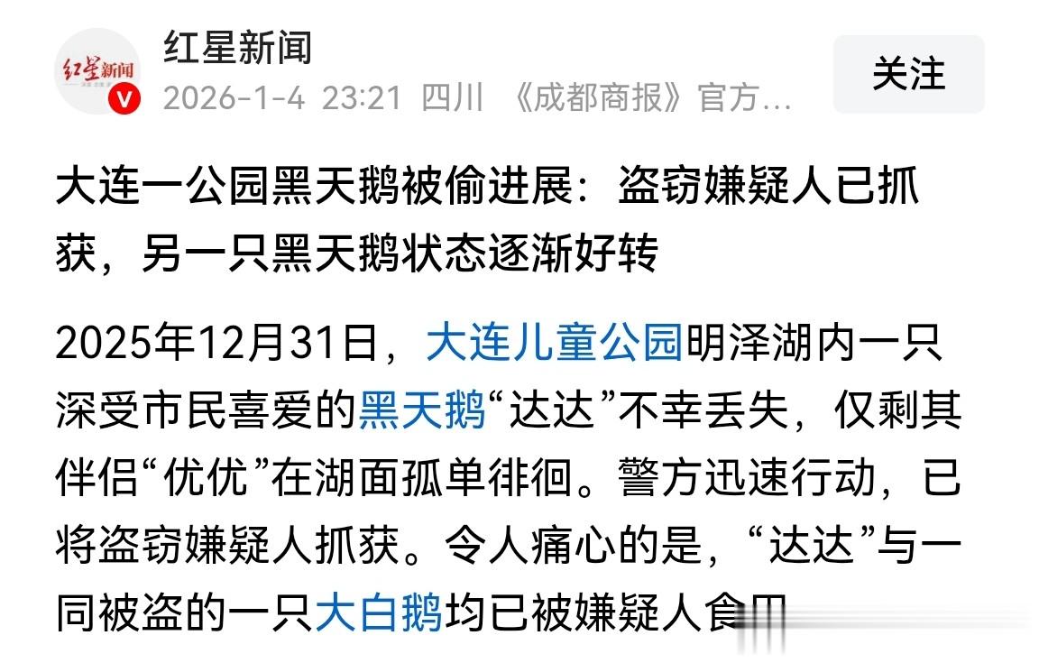 2025年的最后一天,大连儿童公园内的一对黑天鹅被人偷走一只,剩下落单的伴侣不吃不喝,令大家担忧。当地警方获悉后,立即行动已将嫌疑人抓获,嫌疑人不止偷走了黑天鹅,还偷了一只大白鹅。