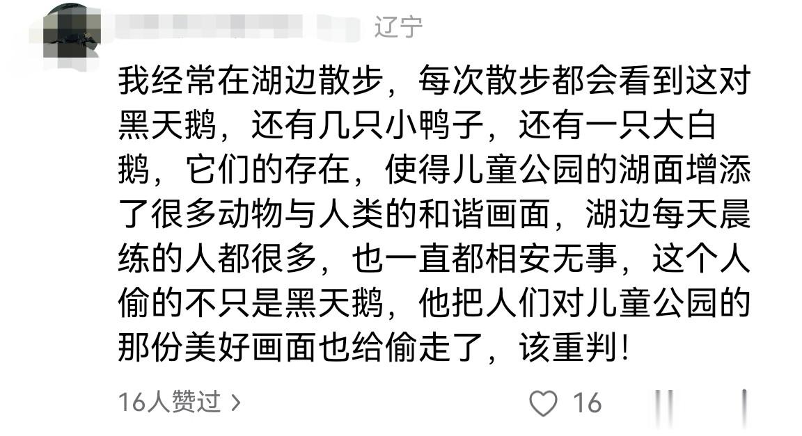一位当地网友说,他经常到湖边散步,每次散步都会看到这对黑天鹅,还有几只小鸭子,还有一只大白鹅。它们的存在,使得儿童公园的湖面增添了很多动物与人类的和谐画面,湖边每天晨练的人很多,也一直都相安无事,这个人偷的不只是天鹅,他把人们对儿童公园的那份美好也给偷走了,该重罚。