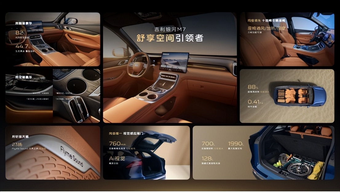 在人性化实用设计上,银河M7兼顾储物需求与使用体验,打造了灵活多样的空间设计与贴心细节,适配家庭出行的多元场景。整车打造30处精巧储物空间,门板、扶手箱、中控台下等区域的储物格均经过人性化设计,水杯、手机、纸巾、小零食等杂物都能各归其位,让座舱更整洁;后备厢采用创新复式双层设计,常规容积达700L同级最大,最大可拓展至1990L,还设计有128L隐藏式真储物夹层,露营装备、儿童推车、行李箱等大件物品都能轻松容纳。