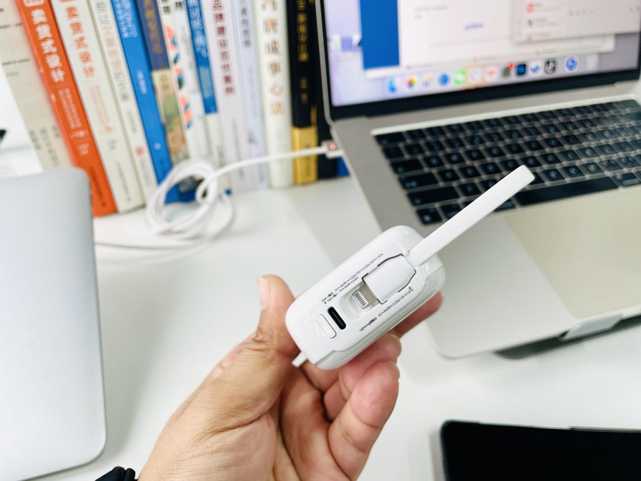 它的侧面巧妙地收纳着一长一短两根充电线:一根Lightning线,一根Type-C线。你需要用时,轻轻一拉即可;用完顺着机身凹槽绕回去,严丝合缝。这个设计,治好了我最大的“充电健忘症”。