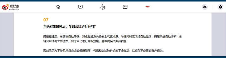 “高速碰撞后,车窗会自动降低,对应碰撞方向的安全气囊点爆,与此同时双闪灯自动激活,高压系统自动切断,车辆会自动刹车并驻车,同时自动进行呼叫救援,全维度保护乘员安全”。