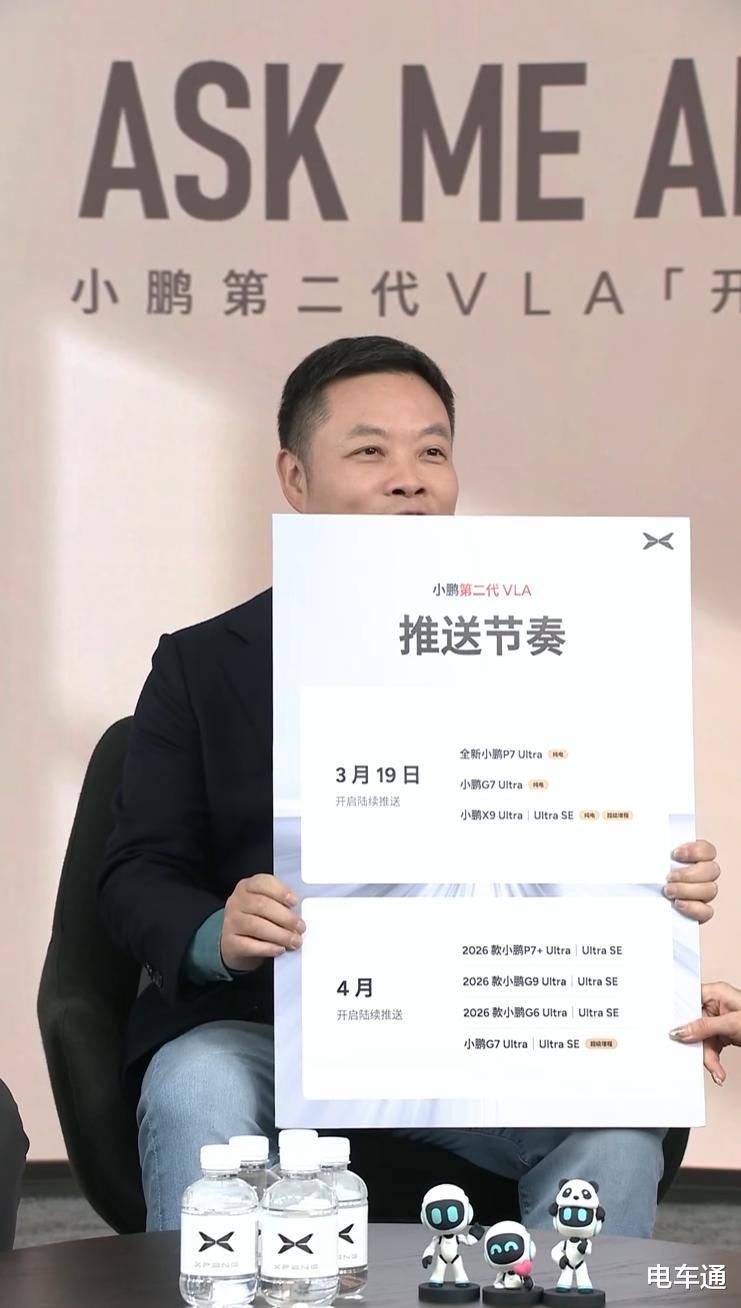 何小鹏宣布,第二代VLA将于3月19日开始陆续推送。全新小鹏P7 Ultra纯电版、小鹏G7 Ultra纯电版、小鹏X9 Ultra/Ultra SE纯电版和超级增程版首批推送;2026款小鹏P7 Ultra/Ultra SE、G9 Ultra/Ultra SE、G6 Ultra/Ultra SE,以及G7 Ultra/Ultra SE超级增程版,将于4月开启推送。
