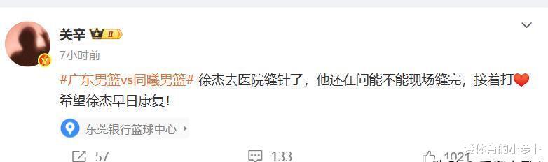根据广东队随队记者关辛的报道,徐杰脸部受伤出血,眉骨位置开裂,在医院缝了至少三针。令人动容的是,在离场前,徐杰还焦急地询问队医,能否就在现场进行缝合,以便他能尽快回到场上帮助球队。