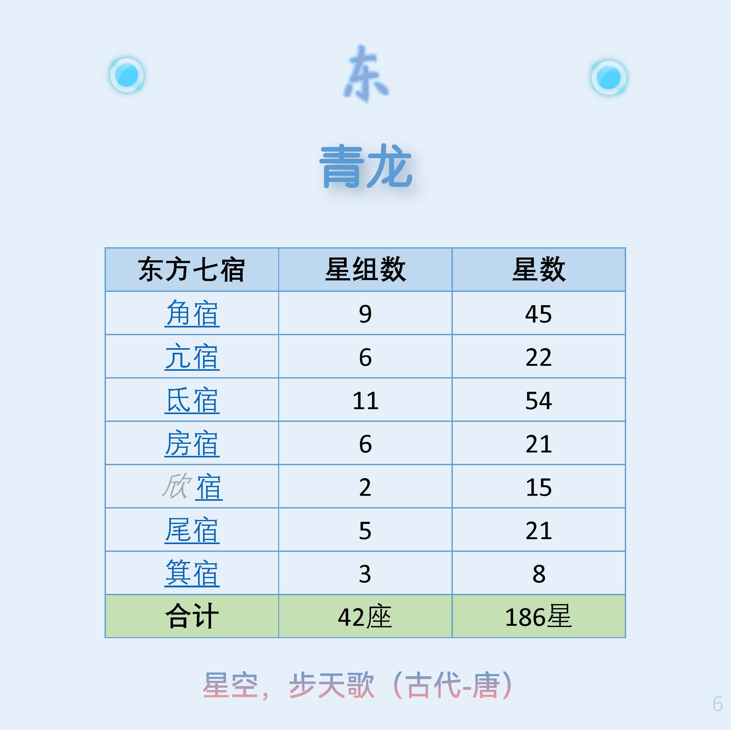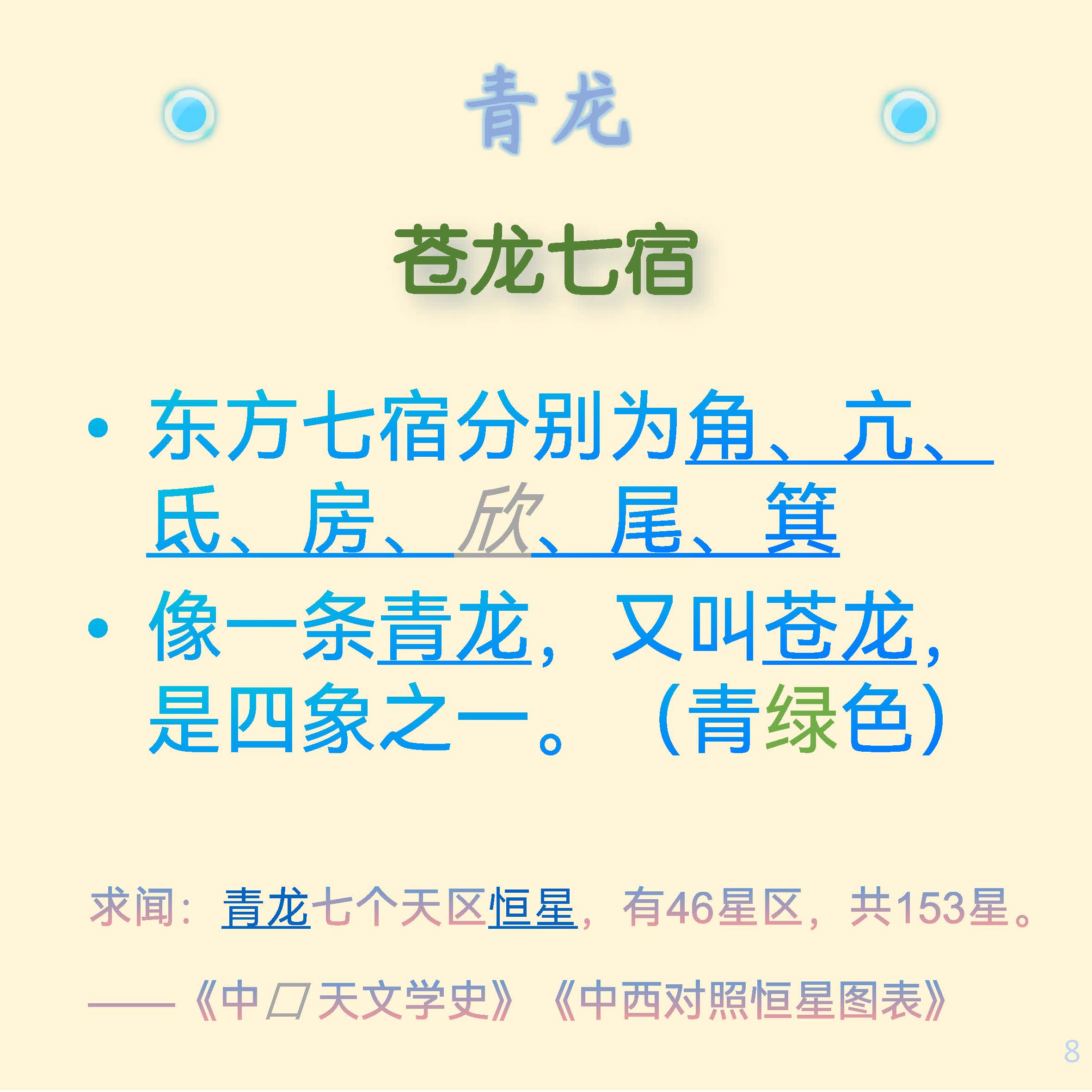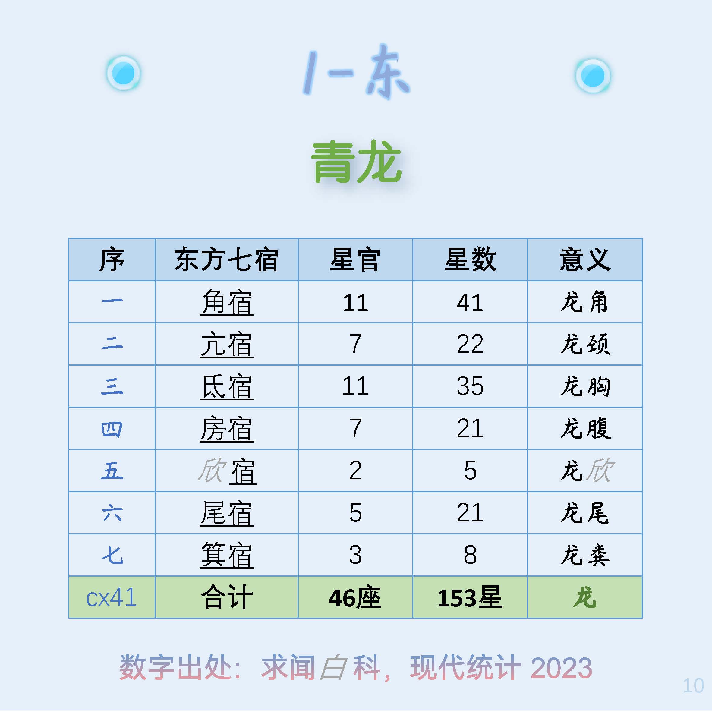 求闻:青龙七个天区恒星,有46星区,共153星。