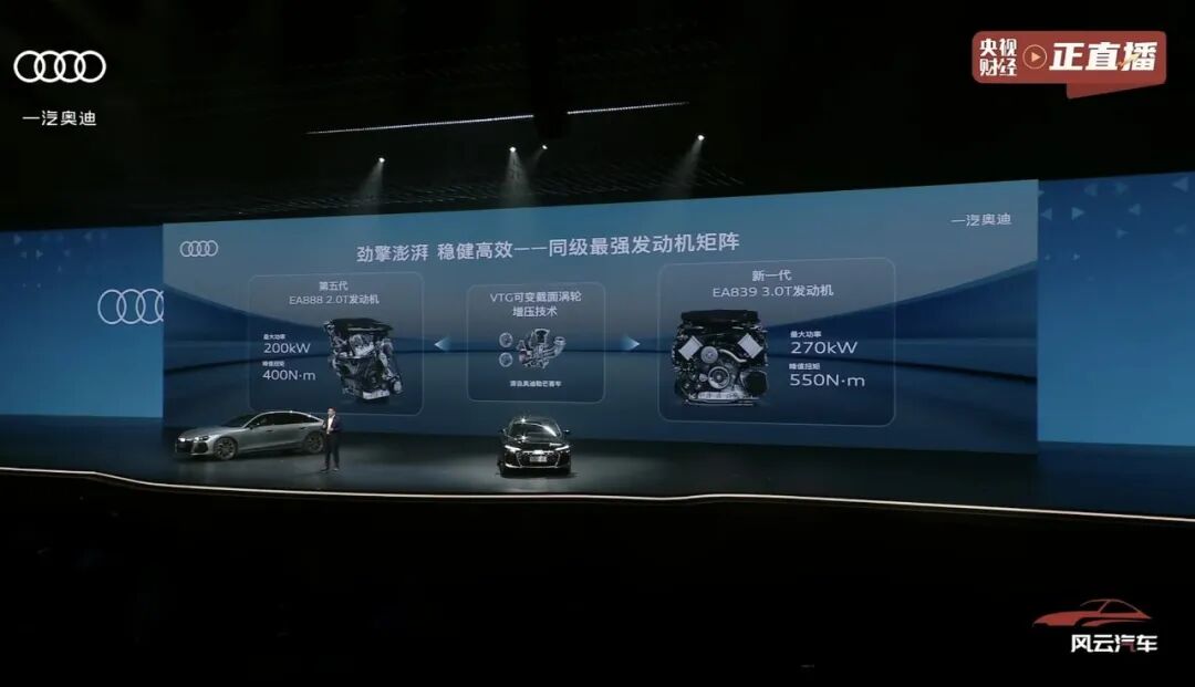 新车搭载新一代EA839 3.0T发动机和第五代EA888 2.0T发动机。前者为同级唯一配备,最大功率达270kW,峰值扭矩550N·m。后者分低功率与高功率两款,低功率发动机最大功率150kW;高功率发动机基于第五代EA888打造,最大功率200kW,且匹配HDI双电机全域智混技术。