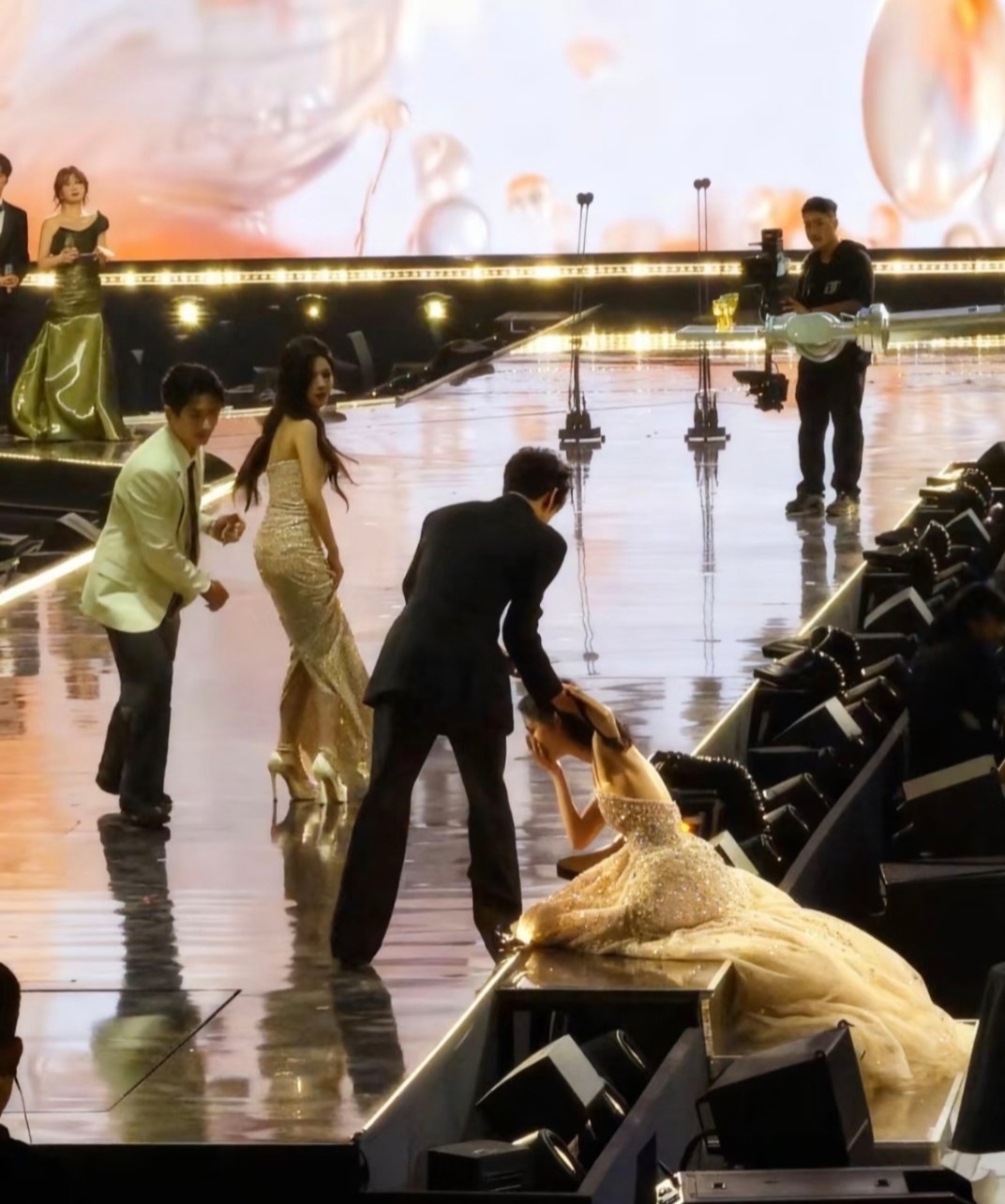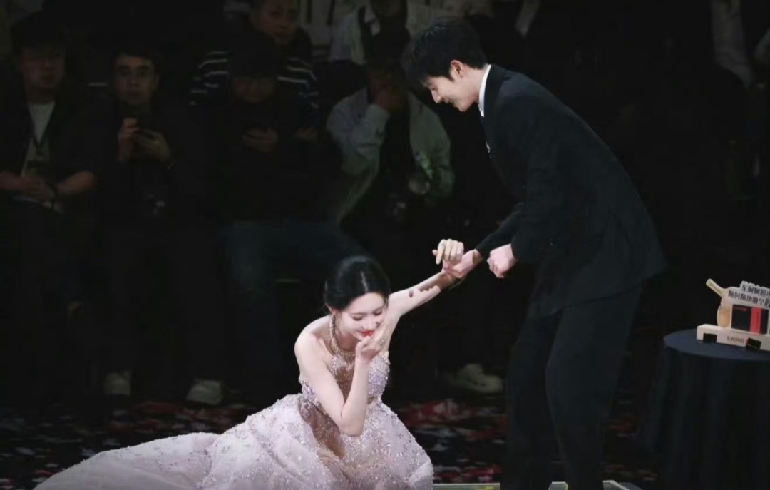 孟子义当时身着金色鱼尾长裙,高高兴兴地去领奖。谁料,高跟鞋踩到了裙摆,一下子失去了平衡,膝盖磕在台阶上,直接跪地滑倒。然而,摔倒瞬间,她的金色裙摆铺展开来,像极了扇形,被闪光灯精准捕捉,构图完美、情绪饱满,意外地炼成了“年度神图”,一夜之间刷屏全网。旁边的李昀锐反应迅速,第一时间伸手试图拉住孟子义,虽未完全避免摔倒,但他的绅士风度得到了大家的认可。下台时,李昀锐更是主动伸手供孟子义搭扶,紧盯其脚下台阶,手臂始终维持支撑姿势,这操作被网友直呼“小说级守护”,让“昀牵孟绕”CP的热度又上了一个新台阶。