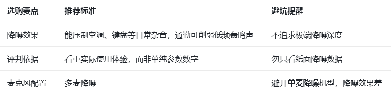 重点看实际表现,能压制空调、键盘声等日常杂音的,通勤时候能削弱低频的轰鸣声即可,不必去追求极端降噪,真实的使用比数字更加好看,还要避开单麦降噪机型,这样的机型降噪效果差