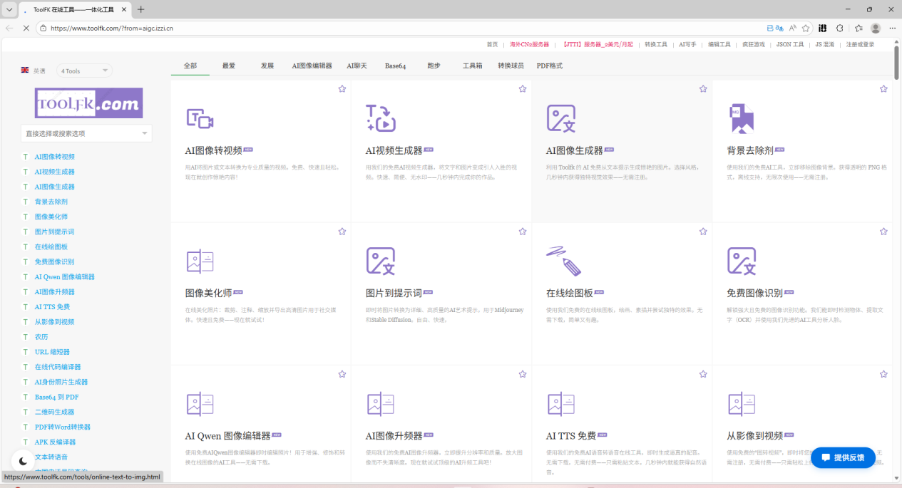 8、TOOLFK这是一个能让工作效率翻倍的一站式在线工具平台,可免费替代市面上 90% 的收费软件。包含 AI 图像转视频、AI 生成视频 / 图片 / 证件照、图像美化器等图片处理工具;PDF 转 Word、PDF 转图片 / PPT 等格式转换工具;甚至还有 AI 单身指导师、AI 催眠治疗师、AI 占心术等趣味功能。