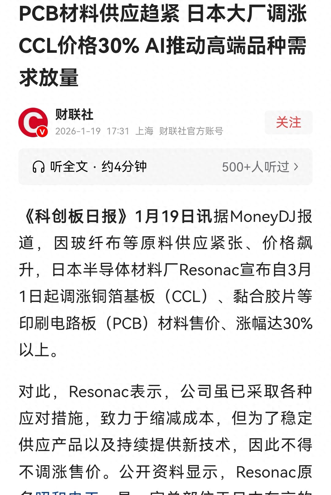 近期PCB材料处于涨价周期,覆铜板等关键材料自2025年下半年持续提价,到2026年1月依然涨价仍在。涨价原因主要系Al服务器需求爆发,单机PCB价值量提升3-5倍,高端铜箔、低介电电子布产能紧缺,验证周期长达6-12个月